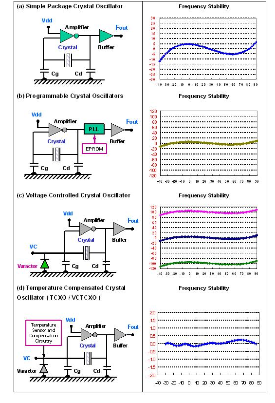當(dāng)把石英共振子與振蕩線路或集成電路(IC)一起整合在一個封裝內(nèi), 由外部提供電源電壓, 形成一個主動組件輸出頻率信號, 就是所謂的石英晶體振蕩器. 石英晶體振蕩器可以藉由單一封裝組件內(nèi)部不同的振蕩線路及輸出線路, 提供不同特性需求的參考頻率(reference frequency). 例如有 石英頻率振蕩器SPXO ( Simple Package Crystal Oscillator ) 或稱為 CXO ( Clock Crystal Oscillator ), 可程序化石英晶體振蕩器PCXO ( Programmable Crystal Oscillator ), 電壓控制石英晶體振蕩器VCXO ( Voltage Controlled Crystal Oscillator ), 溫度補償石英晶體振蕩器TCXO ( Temperature Compensated Crystal Oscillator ) 及 恒溫槽控制石英晶體振蕩器OCXO ( Oven Controlled Crystal Oscillator ).