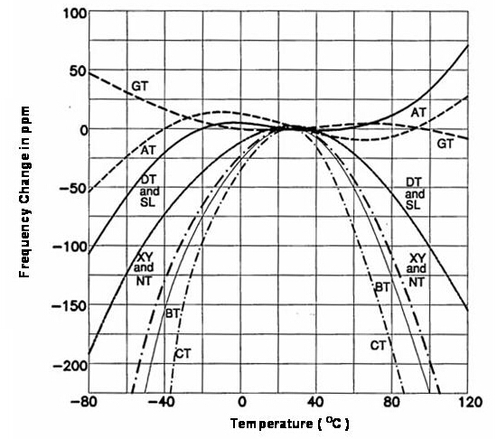 "SG-3030JF 32.7680KB0:ROHS",大部份的石英晶振產品是用于電子線路上的參考頻率基準或頻率控制組件, 所以, 頻率與工作環境溫度的特性是一個很重要的參數. 事實上, 良好的頻率與溫度(frequeny versus temperature)特性也是選用石英做為頻率組件的主要因素之一. 經由適當的定義及設計, 石英晶體組件可以很容易的就滿足到以百萬分之一 (parts per million, ppm) 單位等級的頻率誤差范圍. 若以離散電路方式將LCR零件組成高頻振蕩線路, 雖然也可以在小量生產規模達到所需要的參考頻率信號誤差在ppm或sub-ppm等級要求, 可是這種方式無法滿足產業要達到的量產規模. 石英組件的頻率對溫度特性更是離散振蕩線路無法簡易達成的. 在(圖四) 中提供了數種不同的石英晶體切割角度的頻率對溫度特性曲線.