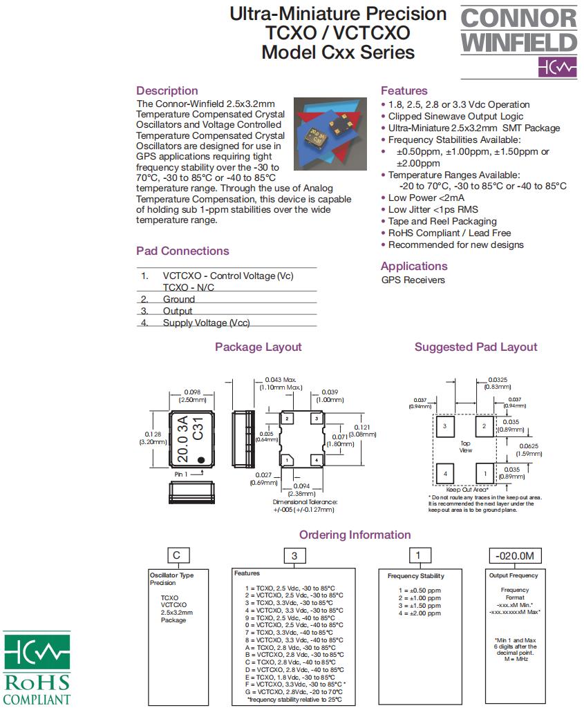 C31-020.0M|TCXO進口溫補晶振|6G基站晶振,ConnorWinfield晶振,C3X有源晶振,C31-020.0M晶振,TCXO進口溫補晶振,3225mm晶振,石英貼片晶振,頻率20MHz,電壓3.3V,工作溫度-30~85°C,頻率穩定性0.5ppm,低功耗晶振,低抖動晶振,6G基站晶振,GOS接收器晶振,衛星導航系統晶振,智能交通控制器晶振.