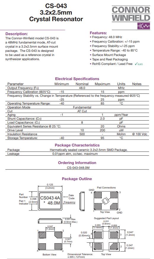 CS-043-048.0M ,3225mm貼片晶振,6G路由器晶振 , ConnorWinfield晶振,CS-043石英晶體諧振器,CS-043-048.0M晶振,無源晶振,3225mm貼片晶振,頻率48MHz,工作溫度-40~85°C,負載8pF,頻率穩定性25ppm,高穩定性晶振,低老化晶振,6G路由器晶振,頻率合成器晶振,便攜式設備晶振,醫療保健晶振,工業自動化晶振.