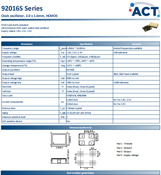 ACT晶振,92016S晶振,時鐘晶體振蕩器.貼片石英晶振,體積小,焊接可采用自動貼片系統(tǒng),產品本身小型,表面貼片晶振,特別適用于有小型化要求的電子數碼產品市場領域,因產品小型,薄型優(yōu)勢,耐環(huán)境特性,包括耐高溫,耐沖擊性等,在移動通信領域得到了廣泛的應用,晶振產品本身可發(fā)揮優(yōu)良的電氣特性,滿足無鉛焊接的高溫回流溫度曲線要求.