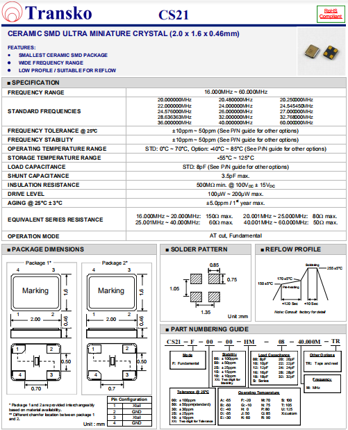 Transko晶振,CS21晶振,高性能石英晶體.貼片石英晶體,體積小,焊接可采用自動貼片系統,產品本身小型,表面貼片晶振,特別適用于有小型化要求的電子數碼產品市場領域,因產品小型,薄型優勢,耐環境特性,包括耐高溫,耐沖擊性等,在移動通信領域得到了廣泛的應用,晶振產品本身可發揮優良的電氣特性,滿足無鉛焊接的高溫回流溫度曲線要求.