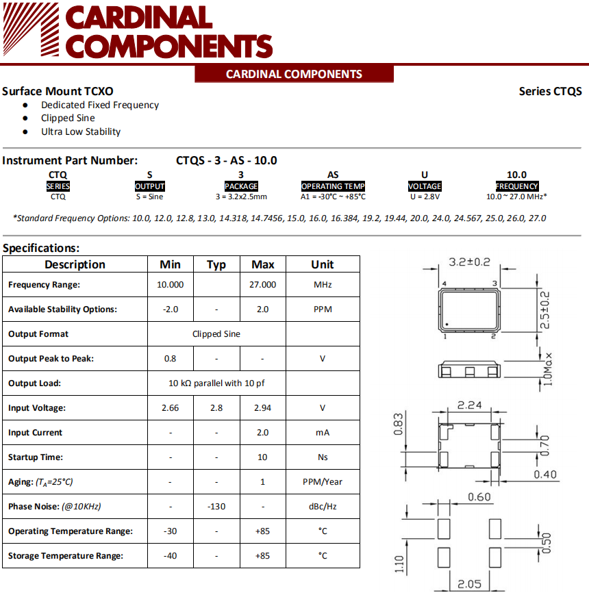 Cardinal晶振,CTQS晶振,溫度補償晶振.貼片式石英晶體振蕩器,低電壓啟動功率,并且有多種電壓供選擇,比如有1.8V,2.5V,3.3V,3.8V,5V等,產品被廣泛應用于,平板筆記本,GPS系統,光纖通道,千兆以太網,串行ATA,串行連接SCSI,PCI-Express的SDH/SONET發射基站等領域.符合RoHS/無鉛.