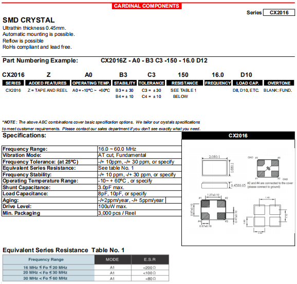 Cardinal晶振,CX2016晶振,進(jìn)口環(huán)保晶振.小型貼片石英晶振,外觀尺寸具有薄型表面貼片型石英晶體諧振器,特別適用于有小型化要求的市場領(lǐng)域,比如智能手機(jī),無線藍(lán)牙,平板電腦等電子數(shù)碼產(chǎn)品.晶振本身超小型,薄型,重量輕,晶體具有優(yōu)良的耐環(huán)境特性,如耐熱性,耐沖擊性,在辦公自動化,家電相關(guān)電器領(lǐng)域及Bluetooth,Wireless LAN等短距離無線通信領(lǐng)域可發(fā)揮優(yōu)良的電氣特性,滿足無鉛焊接的回流溫度曲線要求.
