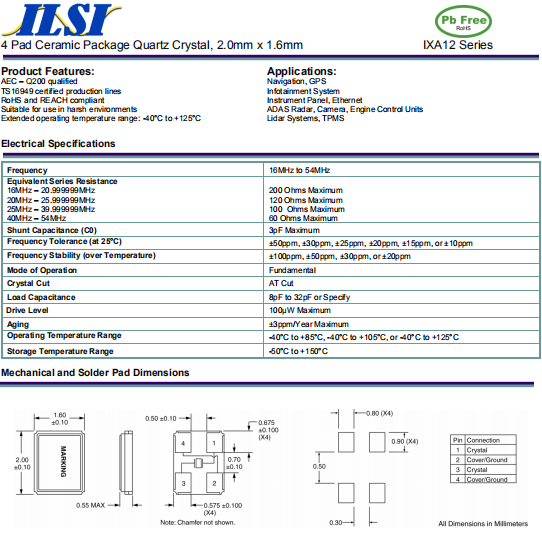 ILSI晶振,IXA12晶振,石英貼片晶振.普通石英晶振,外觀完全使用金屬材料封裝的,產品本身采用全自動石英晶體檢測儀,以及跌落,漏氣等苛刻實驗.產品本身具有高穩定性,高可靠性的石英晶體諧振器,焊接方面支持表面貼裝,外觀采用金屬封裝,具有充分的密封性能,晶振本身能確保其高可靠性,采用編帶包裝,可對應產品應用到自動貼片機告訴安裝,滿足無鉛焊接的高溫回流溫度曲線要求.