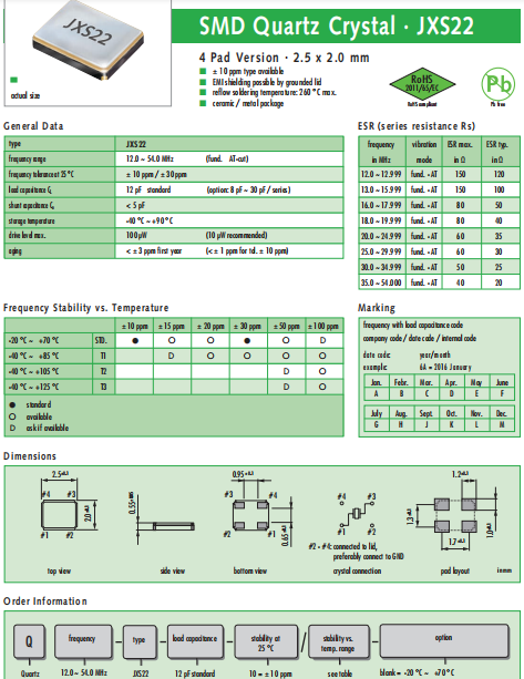 JAUCH晶振,JXS22晶振,高性能貼片晶振.小型表面貼片晶振型,是標準的石英晶體諧振器,適用于寬溫范圍的電子數碼產品,家電電器及MP3,MP4,播放器,單片機等領域.可對應12.000MHz以上的頻率,在電子數碼產品,以及家電相關電器領域里面發揮優良的電氣特性,滿足無鉛焊接的回流溫度曲線要求.