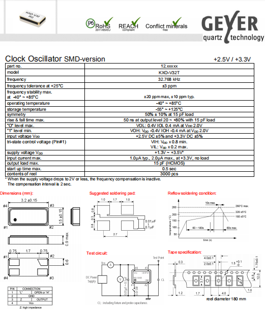 Geyer晶振,KXO-V32T晶振,時鐘晶體振蕩器.有源晶振,是只晶體本身起振需要外部電壓供應,起振后可直接驅動CMOS 集成電路,產品本身已實現與薄型IC(TSSOP封裝,TVSOP封裝)同樣的1mm厚度,斷開時的消費電流是15 µA以下,編帶包裝方式可對應自動搭載及IR回流焊接(無鉛對應)產品有幾種電壓供選1.8V,2.5V,3V3.3V,5V,以應對不同IC產品需要.