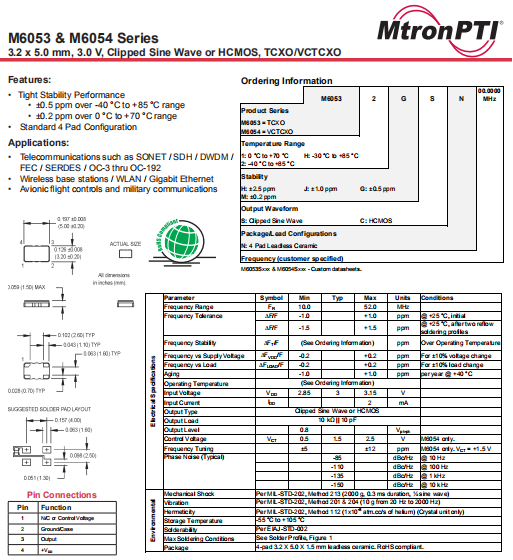 MTRONPTI晶振,M6053晶振,TCXO晶體振蕩器.5032mm體積的石英晶體振蕩器,有源晶振,該產品可驅動2.5V的溫補晶振,壓控晶振,VC-TCXO晶體振蕩器產品,電源電壓的低電耗型,編帶包裝方式,可對應自動高速貼片機自動焊接,及IR回流焊接(無鉛對應),為無鉛產品,超小型,質地輕.產品被廣泛應用到集成電路,程控交換系統,無線發射基站.