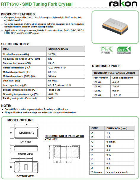 Rakon晶振,RTF1610晶振,音叉石英晶體.超小型,薄型,質地輕的表面貼片音叉型晶體諧振器,手機晶體,產品體積小,特別適用于各種小巧的便攜式消費電子數碼產品,在移動通信領域得到了廣泛的應用,貼片晶振產品本身可發揮優良的電氣特性,滿足無鉛焊接的高溫回流溫度曲線要求.