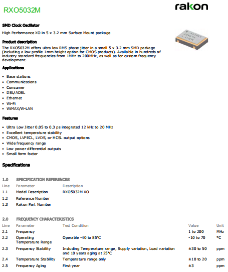 Rakon晶振,RXO5032M晶振,低抖動振蕩器.貼片式石英晶體振蕩器,低電壓啟動功率,并且有多種電壓供選擇,比如有1.8V,2.5V,3.3V,3.8V,5V等,產品被廣泛應用于,平板筆記本,GPS系統,光纖通道,千兆以太網,串行ATA,串行連接SCSI,PCI-Express的SDH / SONET發射基站等領域.符合RoHS/無鉛.