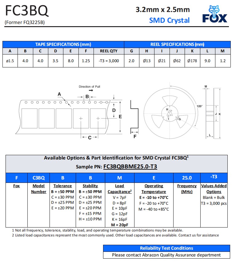 | FC3BQBBME25.0-T3 | Fox晶振 | FC3BQ | 25 MHz | ±50ppm |