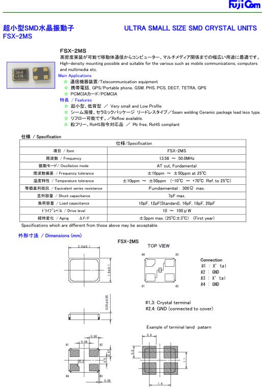 fujicom富士通晶振,FSX-2M無源晶振,攜帶電話晶振,小型貼片石英晶振,外觀尺寸具有薄型表面貼片型石英晶體振蕩器,特別適用于有小型化要求的市場領域,比如智能手機,無線藍牙,平板電腦等電子數碼產品.晶振本身超小型,薄型,重量輕,晶體具有優良的耐環境特性,如耐熱性,耐沖擊性,在辦公自動化,家電相關電器領域及Bluetooth,WirelessLAN等短距離無線通信領域可發揮優良的電氣特性,滿足無鉛焊接的回流溫度曲線要求.