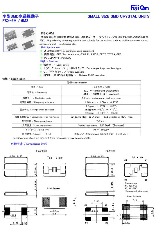 日本Fujicom晶振,FSX-6M無源貼片晶振,小型SMD晶振,貼片晶振本身體積小,超薄型石英晶體振蕩器,特別適用于有目前高速發(fā)展的高端電子數(shù)碼產(chǎn)品,因為貼片無源晶體本身小型化需求的市場領域,小型,薄型是對應陶瓷振蕩器(偏差大)和普通的石英晶體振蕩器(偏差小)的中間領域的一種性價比較出色的產(chǎn)品.產(chǎn)品廣泛用于筆記本電腦,無線電話,衛(wèi)星導航SSD,USB,Blu-ray等用途,符合無鉛焊接的高溫回流焊曲線特性.