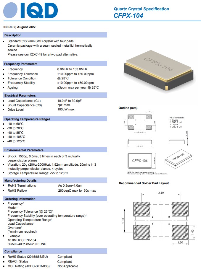 LFXTAL033075REEL,CFPX-104,5032mm,IQD無源晶體,醫療設備晶振,參數表