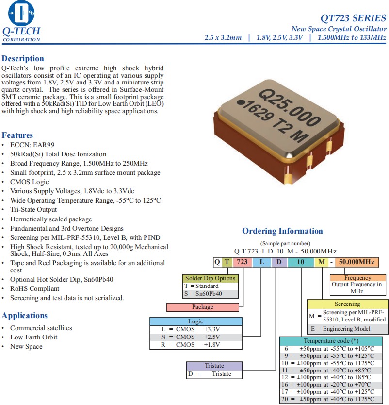 QT723LD12M-52.000MHz,3225mm貼片晶振,6G基站晶振, Q-Tech晶振,歐美進口晶振,QT723石英晶體振蕩器,QT723LD12M-52.000MHz有源晶振,3225mm小尺寸晶振,SMD晶振,頻率52MHz,電壓3.3V,工作溫度-40~85°C,頻率穩定性100ppm,耐高溫晶振,抗沖擊晶振,6G基站晶振,商業衛星應用晶振,低地球軌道應用晶振,新空間應用晶振.
