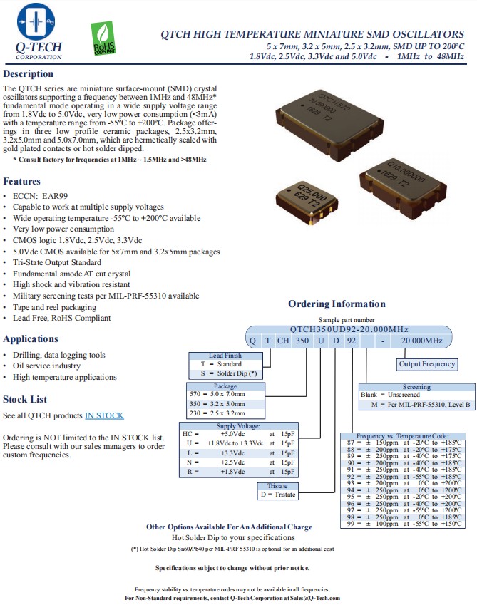 QTCH570ND90-40.000MHz|美國Q-Tech進(jìn)口晶振|6G模塊晶振,Q-Tech晶振,歐美進(jìn)口晶振,型號QTCH570,編碼QTCH570ND90-40.000MHz,是頻率40MHz的基模AT切割晶體,有源晶振,可根據(jù)MIL-PRF-55310提供軍事篩選測試,尺寸7050mm,電壓2.5V,負(fù)載15pF,低功耗晶振,無鉛環(huán)保晶振,耐高溫晶振,6G模塊晶振,鉆井、數(shù)據(jù)記錄工具晶振,石油服務(wù)行業(yè)晶振,高溫應(yīng)用晶振.