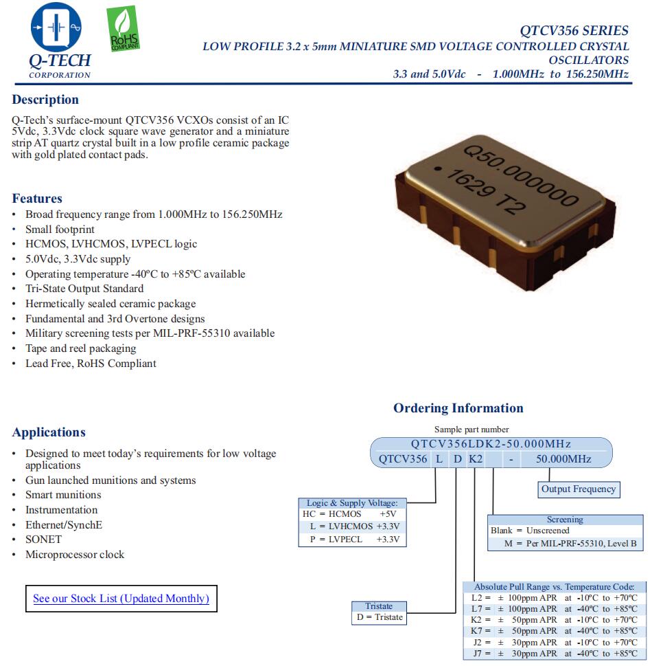 QTCV356PDK7-52.000MHz,6G放大器晶振,LVPECL差分晶振, Q-Tech晶振,QTCV356進口有源晶振,QTCV356PDK7-52.000MHz晶振,5032mm貼片晶振,LVPECL差分晶振,石英晶體振蕩器,頻率52MHz,工作溫度-40~85°C,電壓3.3V,頻率穩定性50ppm,低抖動晶振,低相噪晶振,6G放大器晶振,以太網應用晶振,儀器儀表應用晶振,微處理時鐘晶振,SONET晶振,智能彈藥晶振.