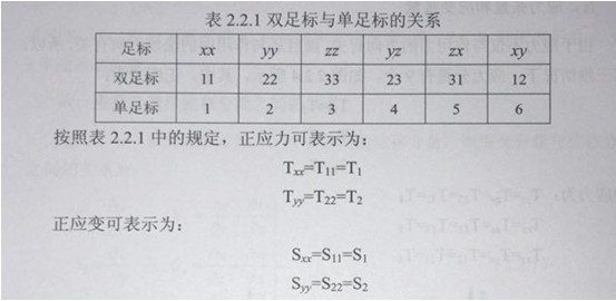 沿x方向應(yīng)力和y方向應(yīng)力的特點(diǎn)是,力的方向與作用面垂直(或力的方向與作用面的法線方向平行)。為了反應(yīng)這兩個(gè)方向在應(yīng)力符號上要附加兩個(gè)足標(biāo),例如Tx和Ty。應(yīng)力的第一個(gè)足標(biāo)表示力的方向,第二個(gè)足標(biāo)表示作用面的法線方向。同理,應(yīng)變也有兩個(gè)足標(biāo),例如Sx和Sy應(yīng)變的第一個(gè)足標(biāo)表示原長度的方向,第二個(gè)足標(biāo)表示伸長量的方向,Tx、Ty又稱正應(yīng)力(或伸縮應(yīng)力),Sx、Sy又稱為正應(yīng)變(或伸縮應(yīng)變)為了簡便,通常將足標(biāo)中的(x,y,z)用(1,2,3)表示,而且將雙足標(biāo)簡化為單足標(biāo),雙足標(biāo)與單足標(biāo)的關(guān)系如表2.2.1所示。