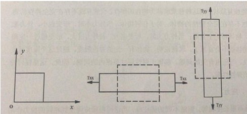 如圖2.2.1(a)所示的小方片,當(dāng)它受到x方向的應(yīng)力作用時(shí),除在x方向產(chǎn)生伸長外,同時(shí)在y方向也產(chǎn)生收縮,如圖2.2.1(b)所示。同樣,當(dāng)小方片受到y(tǒng)方向的應(yīng)力作用時(shí),除了在y方向產(chǎn)生伸長外,同時(shí)在x方向也產(chǎn)生收縮