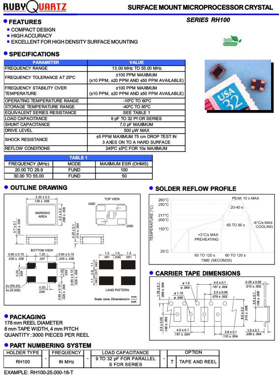 RH100水晶振動子,盧柏進口晶振,RH100-26.000-18-T無源諧振器,超小型表面貼片型SMD晶振,最適合使用在汽車電子領域中,也是特別要求高可靠性的引擎控制用CPU的時鐘部分.低頻晶振可從7.98MHz起對應,小型,超薄型具備強防焊裂性,石英晶體在極端嚴酷的環境條件下也能發揮穩定的起振特性,產品本身具有耐熱,耐振,耐撞擊等優良的耐環境特性,滿足無鉛焊接以及高溫回流溫度曲線要求,符合AEC-Q200標準.