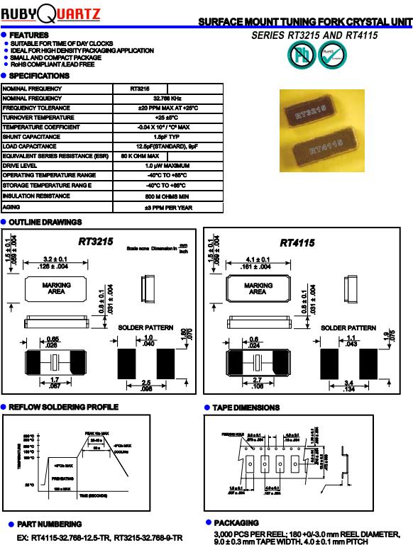 Rubyquartz歐美晶振,RT3215石英晶體,RT3215-32.768K-9-TR諧振器,32.768K時(shí)鐘晶體具有小型,薄型,輕型的貼片晶振表面音叉型晶體振蕩器,產(chǎn)品具有優(yōu)良的耐熱性,耐環(huán)境特性,可發(fā)揮晶振優(yōu)良的電氣特性,符合RoHS規(guī)定,滿足無(wú)鉛焊接的高溫回流溫度曲線要求,金屬外殼的封裝使得產(chǎn)品在封裝時(shí)能發(fā)揮比陶瓷振蕩器外殼更好的耐沖擊性.