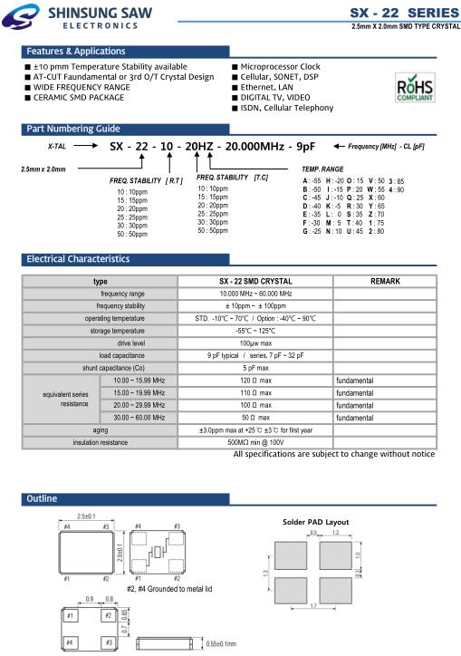 SHINSUNG晶振,SX-22超小型晶振,SX-22-10-20HZ-26.000MHz-9pF晶振,小型貼片石英晶振,外觀尺寸具有薄型表面貼片型石英晶體振蕩器,特別適用于有小型化要求的市場領(lǐng)域,比如智能手機(jī),無線藍(lán)牙,平板電腦等電子數(shù)碼產(chǎn)品.晶振本身超小型,薄型,重量輕,晶體具有優(yōu)良的耐環(huán)境特性,如耐熱性,耐沖擊性,在辦公自動化,家電相關(guān)電器領(lǐng)域及Bluetooth,WirelessLAN等短距離無線通信領(lǐng)域可發(fā)揮優(yōu)良的電氣特性,滿足無鉛焊接的回流溫度曲線要求.