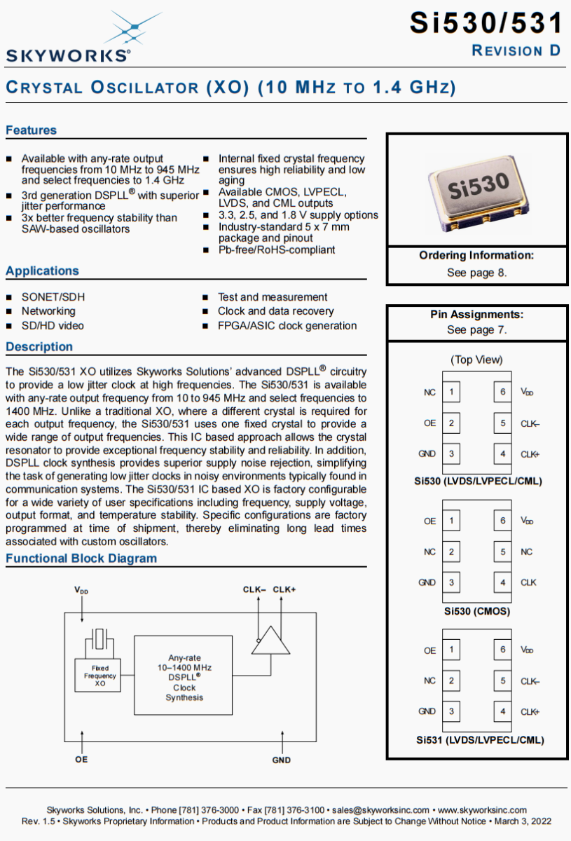 | 536BB106M250DGR | Skyworks晶振 | Si536 | XO | 106.25 MHz | LVDS | 3.3V | ±20ppm |