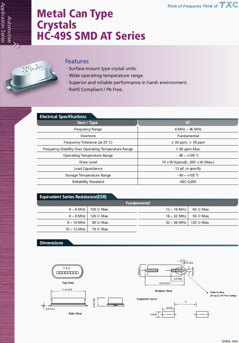 | AT-4.000MFHH-T | TXC晶振 | AT | 4MHz | ±30ppm | ±15ppm | 15pF |
