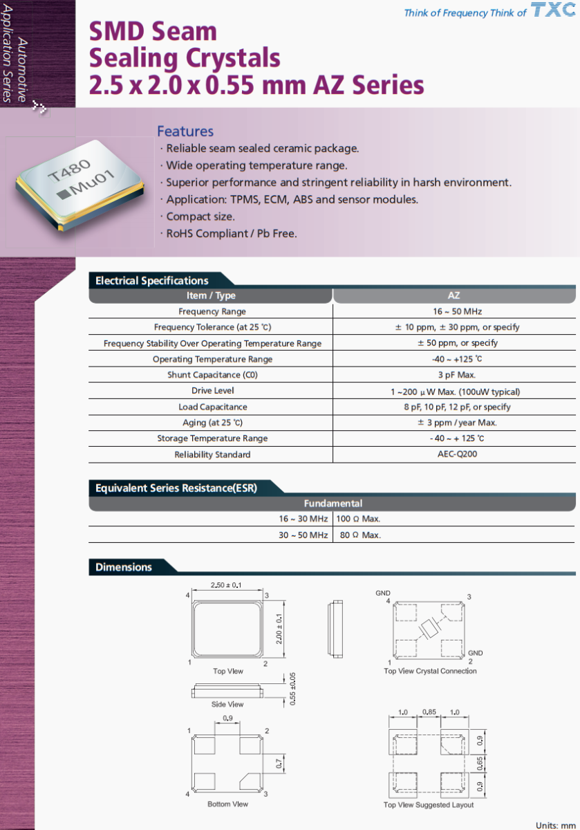 TXC晶振,無鑰匙進入模塊晶振,AZ-37.400MEIQ-T晶振,臺灣TXC晶振公司,晶技晶振,AZ系列SMD接縫,密封晶體,2.5 x 2.0 x 0.55 mm ,特點,可靠的接縫密封陶瓷封裝。工作溫度范圍寬。性能優(yōu)越,在惡劣環(huán)境下具有嚴格的可靠性。應用范圍:TPMS, ECM, ABS,傳感器模塊。.ompact大小。符合rohs標準/不含鉛,臺灣晶振,進口晶振,四腳晶振,無源晶振,網(wǎng)絡設備晶振,汽車晶振,高品質晶振,汽車氛圍燈晶振,大燈控制器晶振,小尺寸晶振,耐高溫晶振,