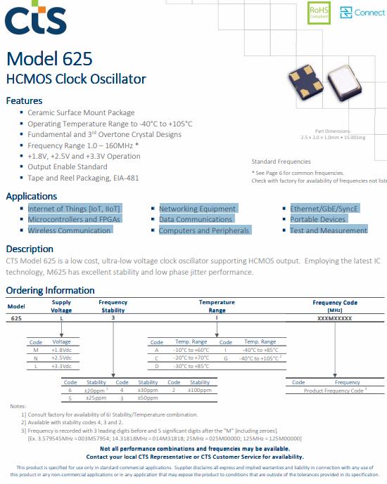 更多>>編碼625M3I020M00000是CTS公司最新IC技術的超低電壓時鐘晶體振蕩