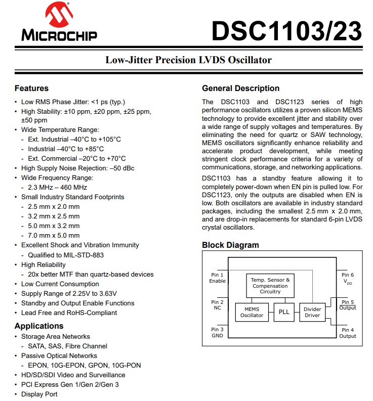 | DSC1103CI5-233.2090T | Microchip晶振 | DSC1103 | 233.209MHz | 2.25 V ~ 3.6 V | MEMS (Silicon) |