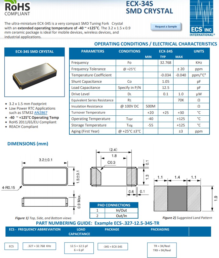 ECS晶振推出超小型ECX-34S系列,編碼ECS-.327-12.5-34S-TR,是一款非常緊湊的SMD音叉晶體,32.768kHz晶振,兩腳貼片晶振,擴展工作溫度范圍為-40℃至+125℃。小體積尺寸3.2x1.5x0.9mm陶瓷封裝,非常適合移動設(shè)備、無線設(shè)備和工業(yè)應(yīng)用,STM32 AN2867等低功耗RTC應(yīng)用,-40℃至+125℃工作溫度,符合RoHS 2011/65/EU標準,符合REACH標準.