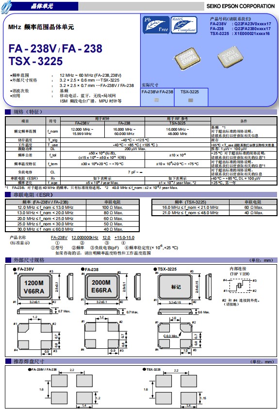 日本愛普生晶振FA-238V是一款小體積尺寸3.2x2.5mm四腳貼片晶振,無源晶振,石英晶體諧振器,F(xiàn)A-238V頻率范圍12.000MHz至15.9999MHz之間,可以在-40℃至+85℃(+105℃)溫度內穩(wěn)定工作,該產品具有超小型,輕薄型,耐熱、耐振、耐沖擊等優(yōu)良的耐環(huán)境特性,3225mm體積貼片晶振,該產品已被確定的高信賴性最適合用于汽車電子部件,在極端嚴酷的環(huán)境條件下也能發(fā)揮穩(wěn)定的起振特性。滿足無鉛焊接的高溫回流溫度曲線要求,符合AEC-Q200標準。被廣泛用于移動通訊,智能手機,平板電腦,汽車電子,移動電話,無線藍牙,ISM頻段電臺廣播,MPU時鐘等.