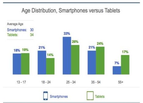 以上圖表按照傳統年齡分組,顯示了智能手機和平板電腦用戶的年齡分布。藍色代表智能手機用戶,綠色代表平板電腦用戶。數據顯示,智能手機用戶的平均年齡低于平板電腦用戶,分別為30歲和34歲。近3/4的智能手機用戶小于等于34歲,而超過2/3平板電腦用戶的年齡大于等于25歲。