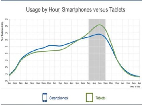 以上圖表顯示了用戶在一天之內不同時段使用應用的情況。藍色曲線代表智能手機用戶,綠色曲線代表平板電腦用戶。數據顯示,在電視節目的黃金時段,即晚上7點到10點,平板電腦應用的使用頻率出現了幅度更大的提升。這表明,相對于智能手機,平板電腦更可能在看電視的同時使用,或是被當作電視的替代品。