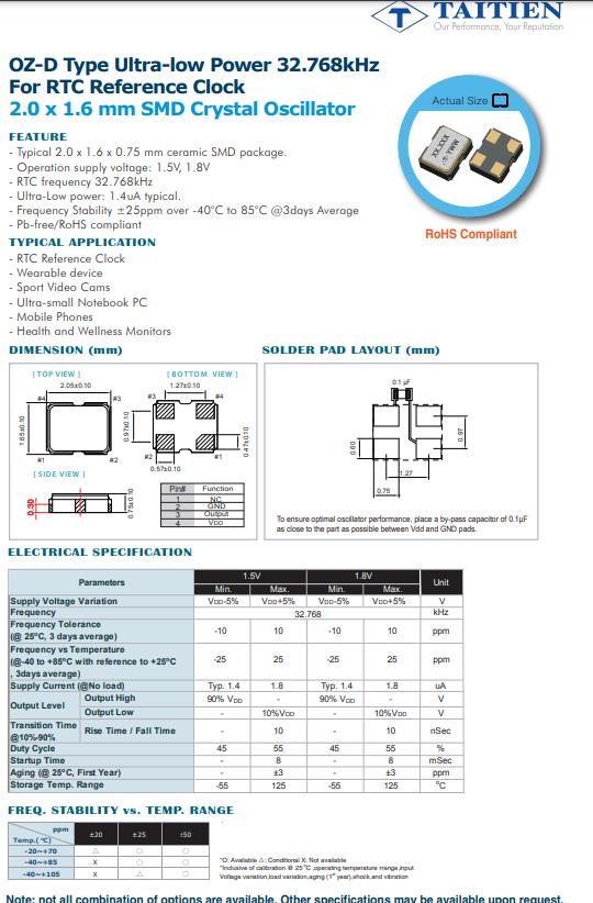 -頻率穩定性±25ppm超過-40oC到85度C @3days平均