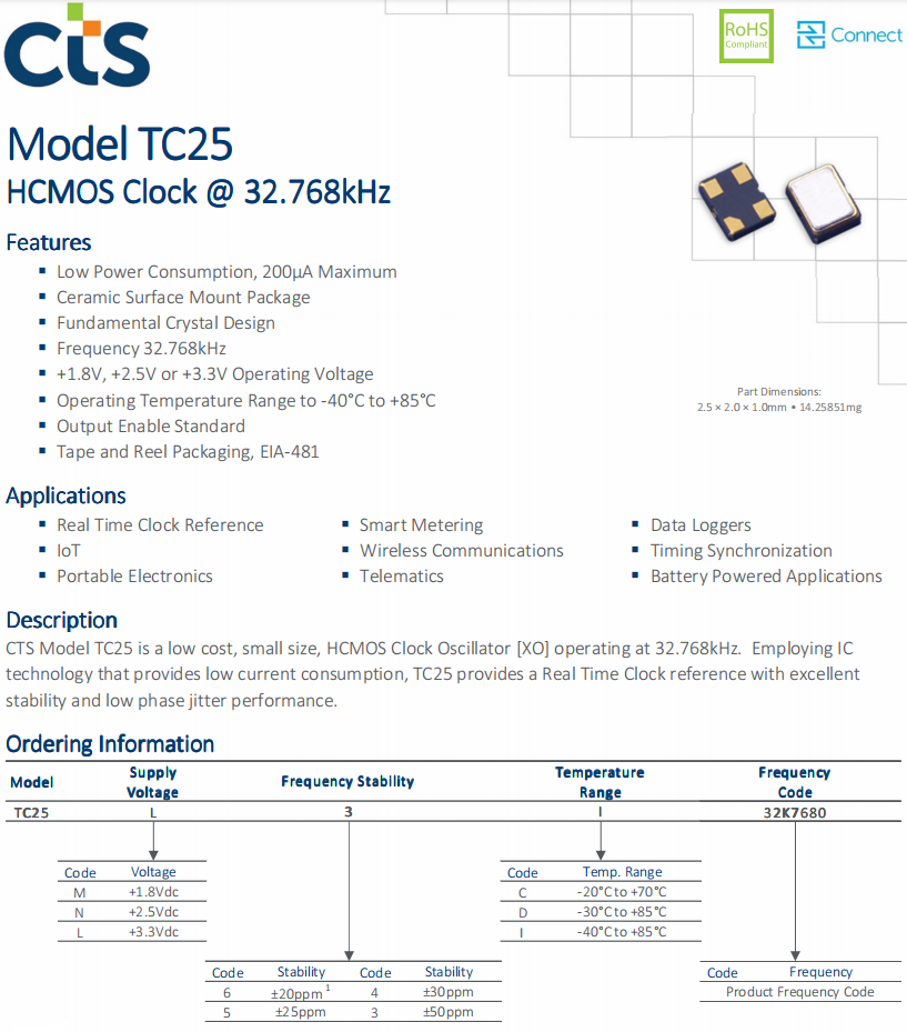 | TC25V5C32K7680 | CTS晶振 | TC25 | 32.768kHz | ±25ppm | 4-SMD, No Lead |