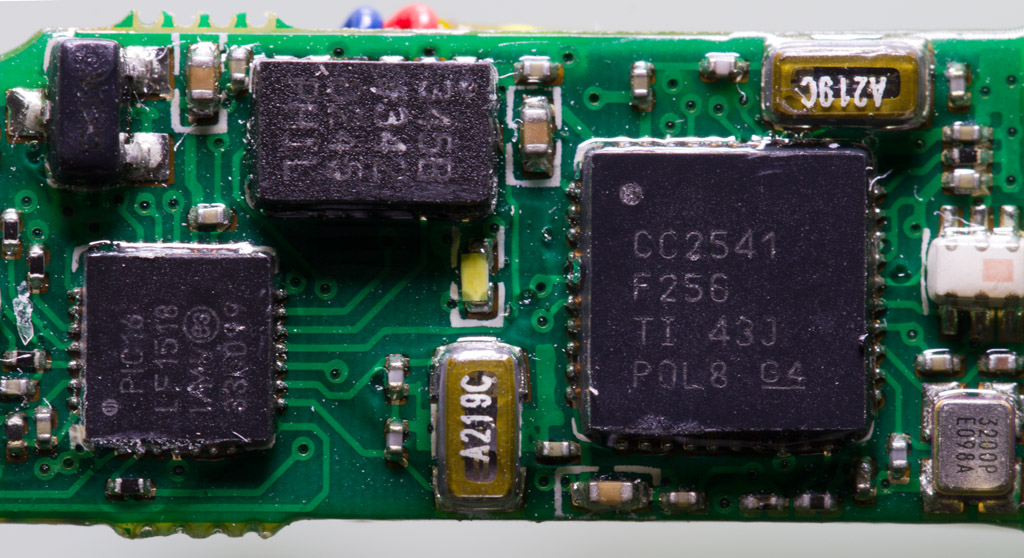 現在就來拆拆手環主機了,由于手環外殼采用熱熔接方式,要拆開手環只能采用暴力方式拆解.揭開外殼,可以看到智能手環主機電路板和零件,從MicroUSB膠塞固定位置上可以看到膠塞頭并沒有完全密封起來,如果游泳時帶著這個手環進入水中可能會導致進水..jpg)