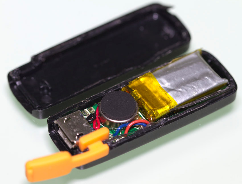 現在就來拆拆手環主機了,由于手環外殼采用熱熔接方式,要拆開手環只能采用暴力方式拆解.揭開外殼,可以看到智能手環主機電路板和零件,從MicroUSB膠塞固定位置上可以看到膠塞頭并沒有完全密封起來,如果游泳時帶著這個手環進入水中可能會導致進水.