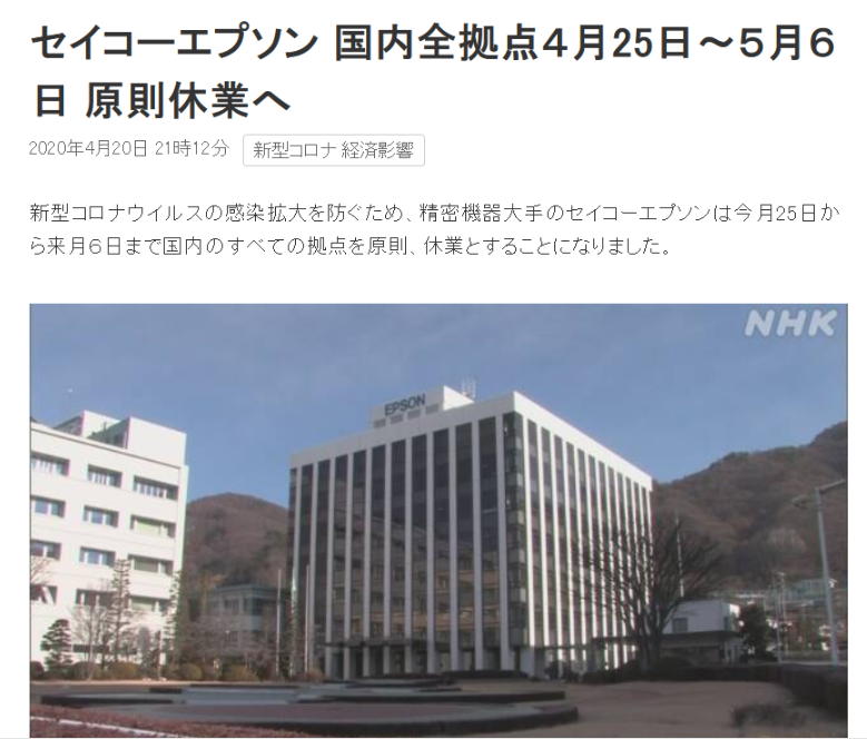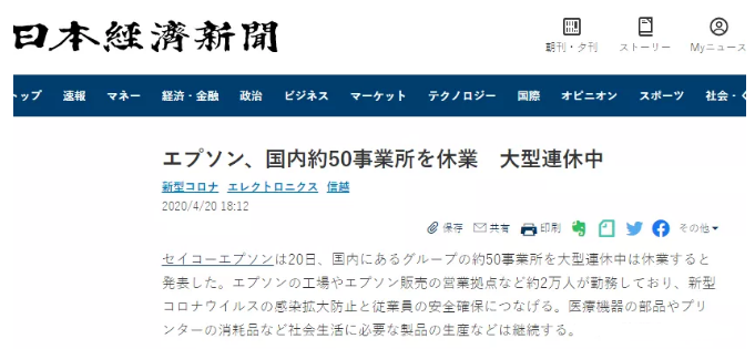 在日本企業中愛普生集團不是首家因新冠病毒疫情影響停工的企業了,較上周有東芝也宣布在日本本土內所有企業停工,相信最近相繼宣布的企業會越來越多。