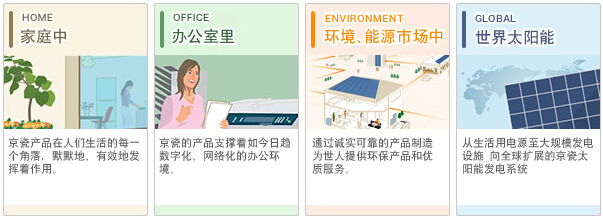 家庭、辦公室、社區(qū)乃至世界各地,京瓷的產品已成為我們生活中不可或缺的一部分.例如,將太陽光轉換成清潔能源的住宅用太陽能發(fā)電系統;用于打印機、復印機、電腦等辦公室里各種通信設備相關業(yè)務的電子零部件;豐富社區(qū)溝通的京瓷通信設備相關業(yè)務等,尤其,京瓷新開發(fā)的能源管理系統可以有效控制電耗.從無電地區(qū)到大型太陽能發(fā)電站,京瓷的太陽能發(fā)電系統產生的清潔能源發(fā)揮著積極重要的作用.京瓷將通過各種高品質產品,為提高人們的生活水平做出貢獻.