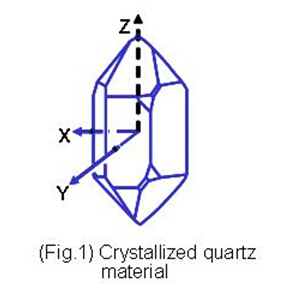 石英是由硅原子和氧原子組合而成的二氧化硅(Silicon Dioxide, SiO2), 以32點(diǎn)群的六方晶系形成的單結(jié)晶結(jié)構(gòu).單結(jié)晶的石英晶體結(jié)構(gòu)具有壓電效應(yīng)特性, 當(dāng)施加壓力在晶體某些方向時(shí), 垂直施力的方向就會(huì)產(chǎn)生電氣電位. 相對(duì)的當(dāng)以一個(gè)電場施加在石英晶體某些軸向時(shí), 在另一些方向就會(huì)產(chǎn)生變形或振動(dòng)現(xiàn)象. 掌握單結(jié)晶石英材料的這種壓電效應(yīng), 利用其發(fā)生共振頻率的特性, 發(fā)揮其精確程度作為各類型頻率信號(hào)的參考基準(zhǔn), 就是水晶震蕩器的設(shè)計(jì)與應(yīng)用. 因?yàn)槭⒕w具有很高的材料Q值,所以絕大部份的頻率控制組件,如共振子及振蕩器,都以石英材料為基礎(chǔ). 以石英為基礎(chǔ)的頻率控制組件可以依其壓電振動(dòng)的屬性, 可以分為體波(bulk wave)振動(dòng)組件及表面聲波(surface acoustic wave)振動(dòng)組件. 體波振動(dòng)組件如石英晶體共振子, 石英晶體濾波器及石英晶體振蕩器, 表面波振動(dòng)組件如表面波濾波器及表面波共振子. 當(dāng)石英晶體以特定的切割方式, 以機(jī)械加工方式予以表面研磨, 完成特定的外型尺寸就是通稱的石英芯片(quartz wafer 或 quartz blank ). 將這個(gè)石英芯片放置在真空還境中, 于表面鍍上電極后,再以導(dǎo)電材料固定在金屬或是陶瓷基座上, 并加以封裝, 就成為一般所謂的石英晶體共振子( quartz crystal resonator ). 利用石英共振子在共振時(shí)的低阻抗特性及波的重迭特性, 用鄰近的雙電極, 可以做出石英晶體濾波器. 將石英振蕩子加上不同的電子振蕩線路, 可以做成不同特性的石英振蕩器. 例如: 石英頻率振蕩器(CXO), 電壓控制石英晶體振蕩器(Voltage Controlled Crystal Oscillator, VCXO), 溫度補(bǔ)償石英晶體振蕩器(Temperature Compensated Crystal Oscillator, TCXO), 恒溫槽控制石英晶體振蕩器(Oven Controlled Crystal Oscillator, OCXO)…等. 相對(duì)于體波諧振的是表面聲波的諧振. 將石英晶體表面鍍以叉狀電極(inter-digital-transducer, IDT)方式所產(chǎn)生的表面振蕩波, 可以制造出短波長(高頻率)諧振的表面聲波共振子(SAW Resonator)或表面聲波濾波器(SAW Filter).