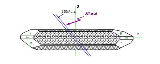 "SG-210SGB 10.0000MM0",在各種不同種類的切割角度方式中, AT角度切割的石英芯片適用在數MHz到數佰MHz的頻率范圍,是石英芯片應用范圍最廣范及使用數量最多的一種切割應用方式. 在(圖五)中, 從石英晶棒X-軸向的上視圖, 可以看到對Z-軸向旋轉約35度的AT 方向. 這在大量生產的技術上也是很好達成的一種作業方式.