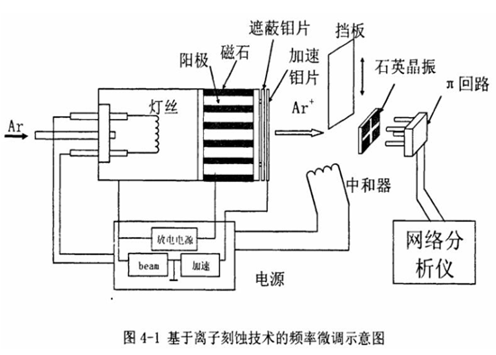圖4-1是基于離子刻蝕技術的頻率微調示意圖[3],晶振離子刻蝕頻率微調方法,當照射面積小于 2~3mm2,在beam電壓低于100V以下就可獲得接近10mA/cm2的高電流密度的離子束,離子束的刻蝕速度在寬范圍內可進行調節。圖中采用的是小型熱陰極PIG型離子槍,放電氣體使用Ar,流量很小只需035cc/min。在:圓筒狀的陽極周圍安裝永久磁石,使得在軸方向加上了磁場這樣的磁控管就變成了離子透鏡[17], 可以對離子束進行聚焦。熱陰極磁控管放電后得到的高密度等離子,在遮蔽鉬片和加速鉬片之間加高達1200V高壓后被引出。并且可以通過對熱陰極的控制調整等離子的速度。