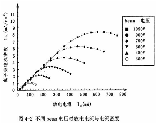 圖4-2表示的是在不同的beam電壓下,隨著放電電流的變化,進口晶振的電極膜處(與離子槍加速鉬片的距離為25mm)所測得的電流密度。從圖中可以知道,對于不同的beam電壓,放電電流變化時,都有相對應的放電電流使得電流密度達到最大。本文說所的離子刻蝕頻率微調就是采用了各不同beam電壓時的最大電流密度進行的。當設定好調整速度后,根據計算決定beam電壓,然后根據該電壓下最大的電流密度計算出放電電流。