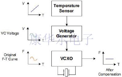 模擬TCXO的標準框圖如圖3所示.在校準過程之前,VCXO(電壓控制晶體振蕩器)的頻率在25℃時約為+/-15ppm,通常在+/-10ppm的范圍內.工作溫度.經過補償網絡后,將電壓施加到VCXO中的變容二極管.電容變化補償了晶體的fvs.T特性,為+/-0.5ppm(-30~85℃).